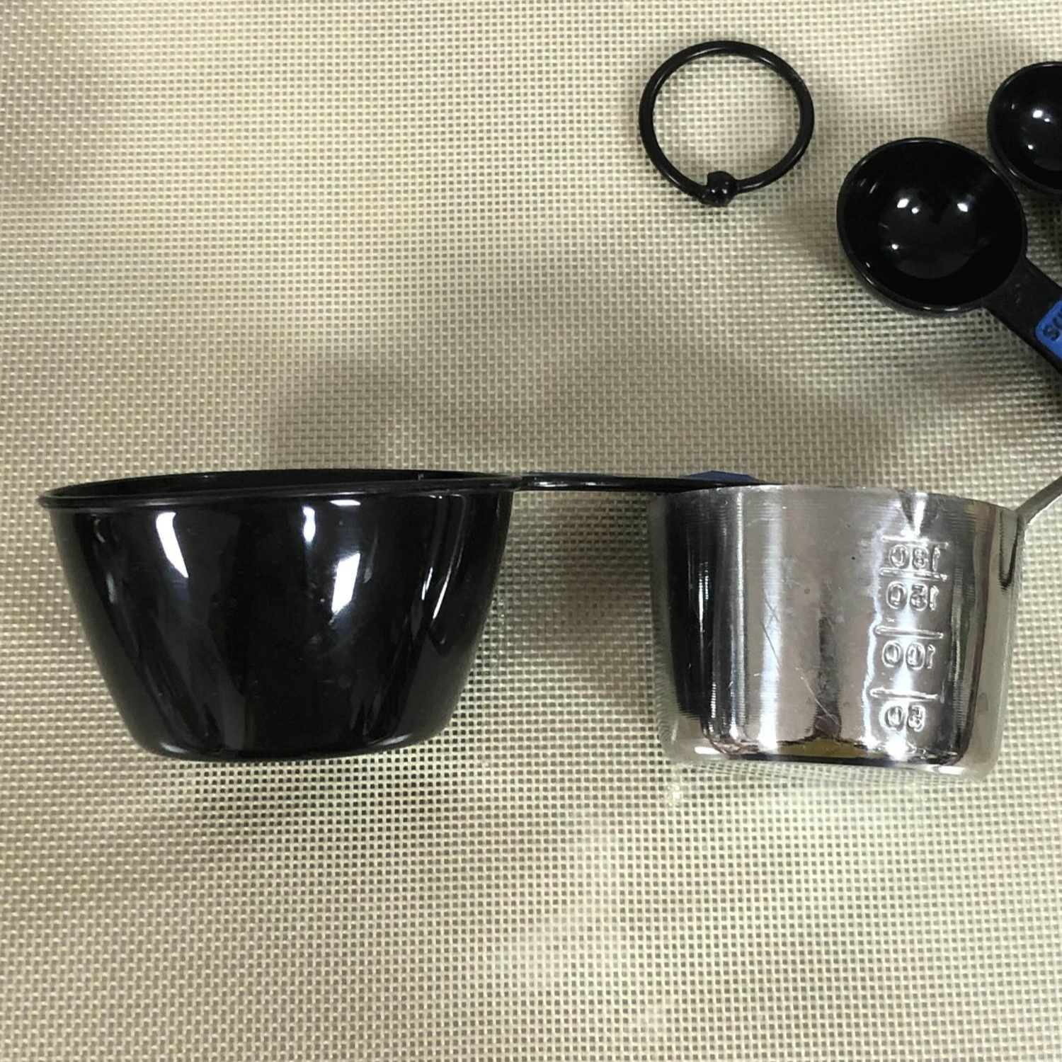 오른쪽의 스테인리스 재질의 계량컵이 한국산이구요. 물론 이거는 액체류에도 사용하는 다목적 계량컵이라 완전한 비교대상이 아닐 수도 있어요.