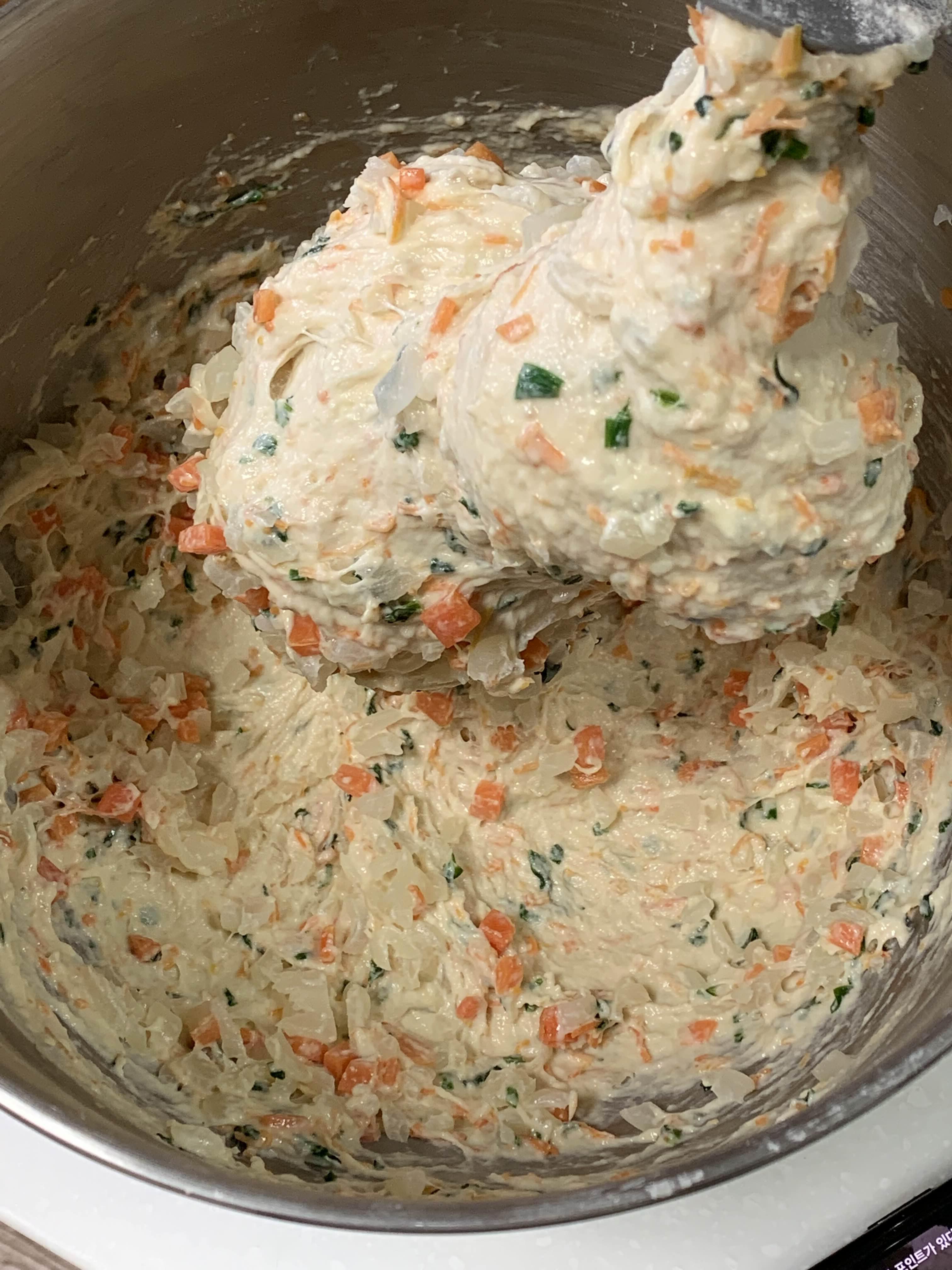 4. 반죽이 100%까지 되면, 준비한 볶은채소를 넣고 마저 반죽한다.
