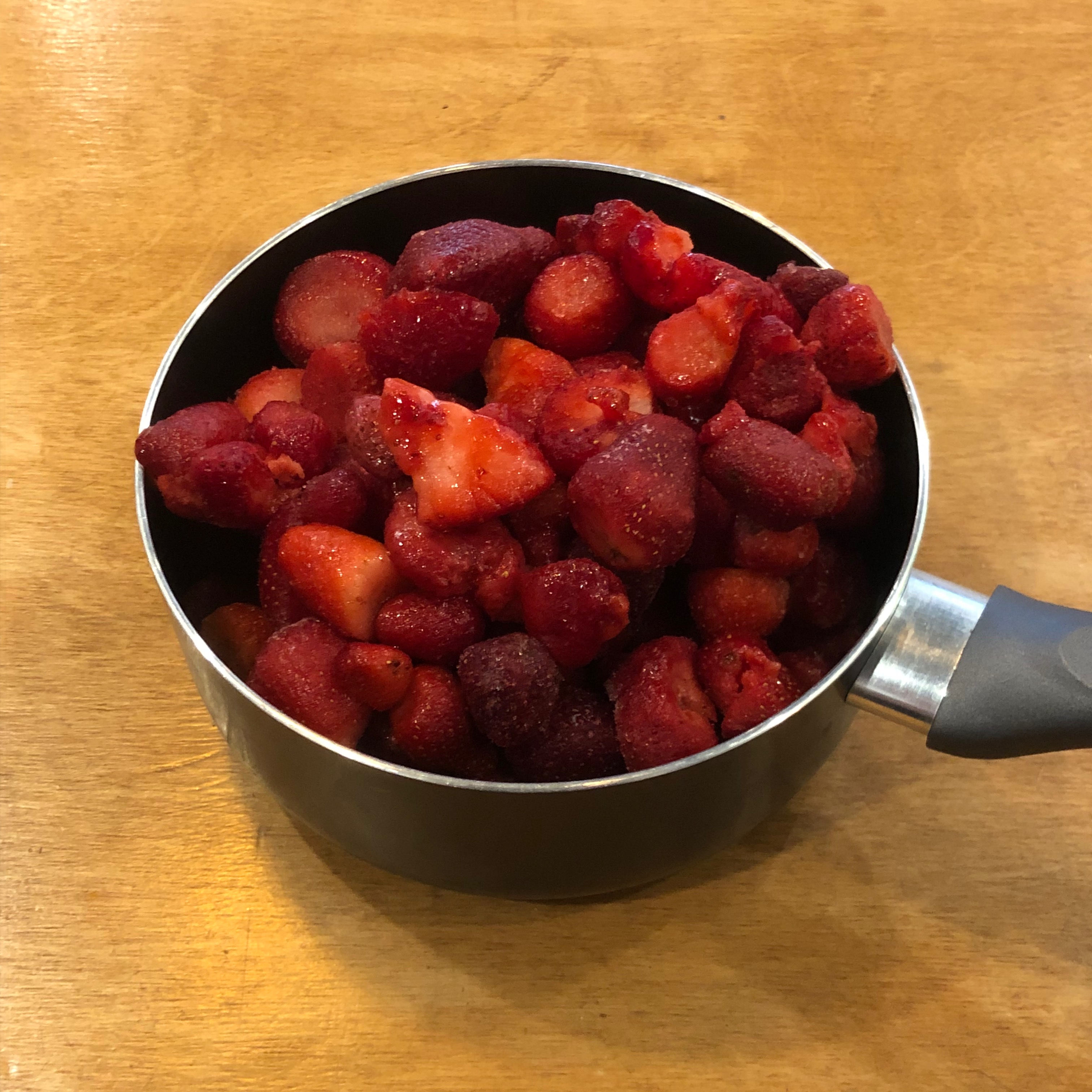 꽁꽁 언 상태의 냉동 딸기를 꺼내 상온에서 꺼내 줍니다. 끓일 때 사용할 냄비에 꺼내 두면 설거지거리를 줄일 수 있으니, 이 편이 낫다! 끓일 때는 어떤 용기를 사용해도 무방해요. 양이 적다면(1kg 이내) 약간 깊이 있는 프라이팬을 사용하길 추천합니다. 왜냐하면 열을 받는 면적을 최대한 늘리면 시간을 조금이나마 단축할 수 있기 때문이에요.