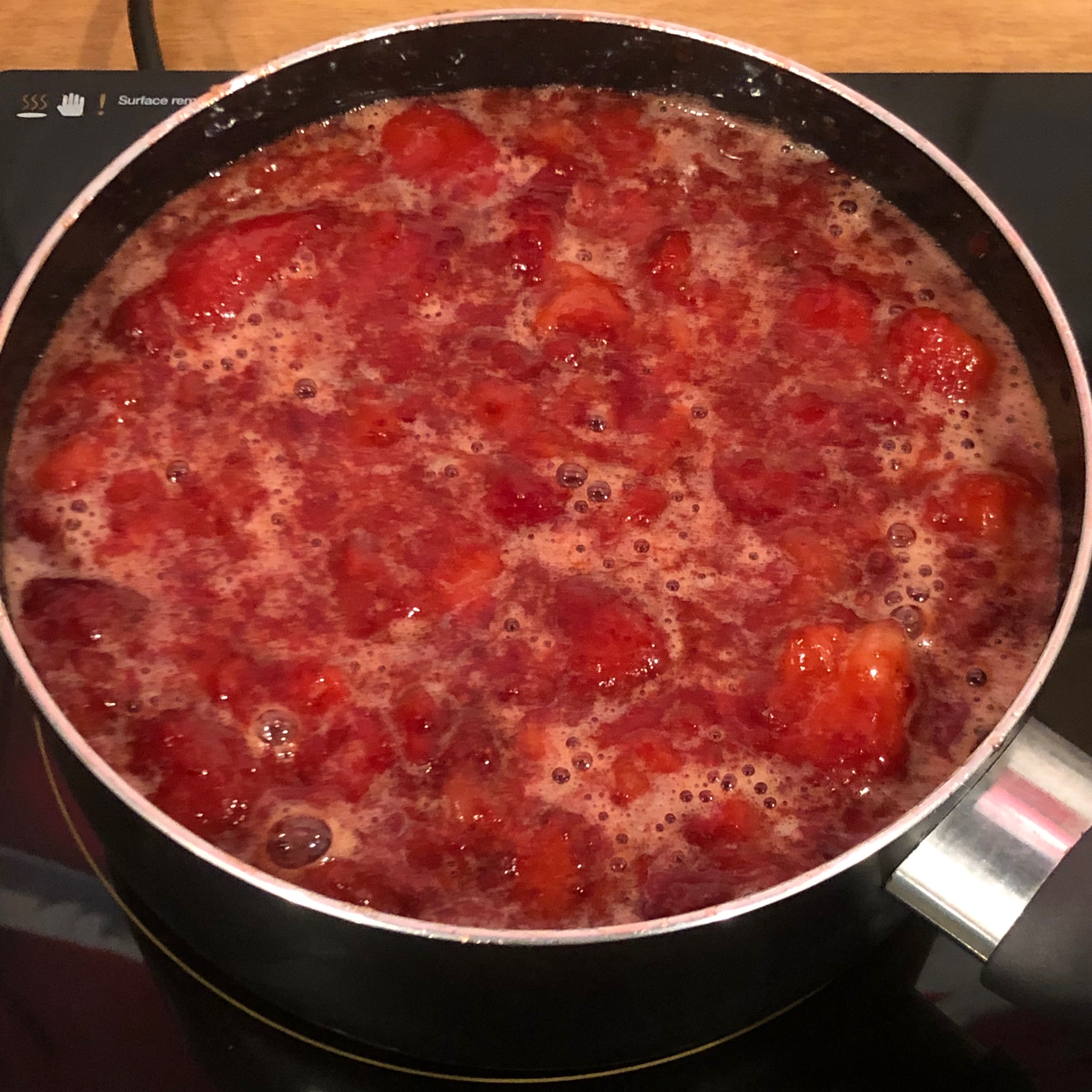 또한, 저는 과육이 있는 편을 선호하기 때문에, 사진에서 보이듯이 작은 알들은 살려줬어요. 가열을 하면 어느정도 과육이 풀어지기 때문에, 작은 딸기들은 살려두면 씹는 맛이 나요. 저는 직접 만든 잼을 먹을 때 씹히는 과육이 없다면, 시판 딸기잼보다 나을 게 없다고 생각해요.